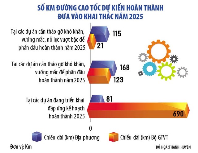 Theo Cục Quản lý đầu tư xây dựng (Bộ GTVT), bên cạnh các dự án có khả năng hoàn thành, thậm chí vượt tiến độ, vẫn còn tới 8 dự án/281 km (Bộ GTVT 3 dự án/123 km; các địa phương 5 dự án/158 km) cần phải tập trung tháo gỡ các khó khăn về giải phóng mặt bằng, nguồn vật liệu xây dựng, tổ chức thi công 3 ca, 4 kíp mới có thể về đích đúng tiến độ.