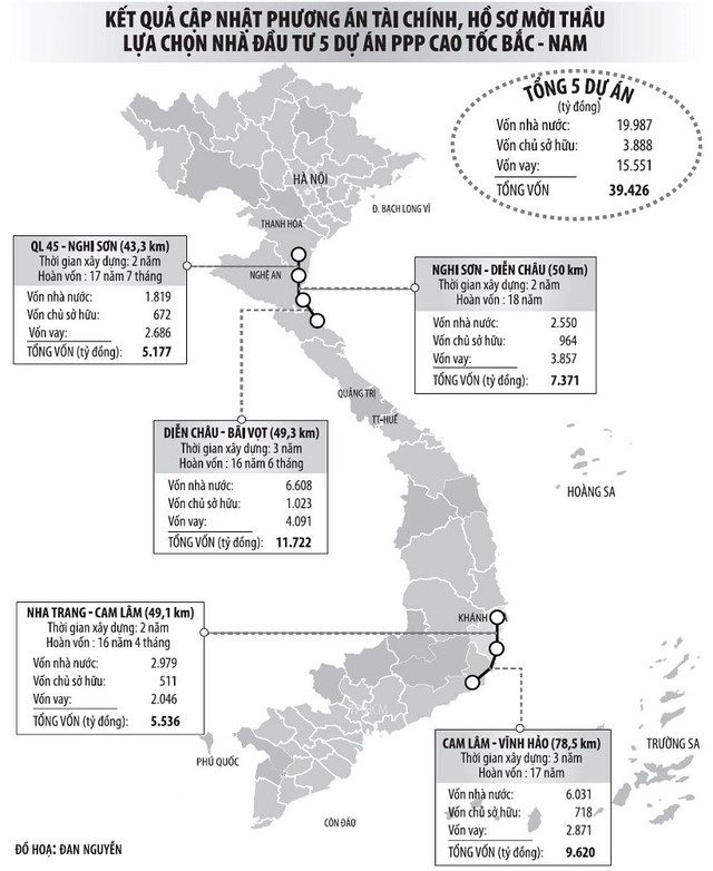 Kết quả mở thầu cho thấy, trong 5 dự án thành phần đầu tư theo phương thức PPP, đến hết thời điểm gia hạn đóng thầu, có 4 dự án thành phần (Quốc lộ 45 - Nghi Sơn, Diễn Châu - Bãi Vọt, Nha Trang - Cam Lâm và Cam Lâm - Vĩnh Hảo) đã có nhà đầu tư nộp hồ sơ dự thầu (8 nhà đầu tư độc lập hoặc liên danh nhà đầu tư).