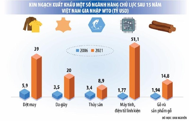 WTO và hệ thống các FTA đã và đang mở rộng cánh cửa thị trường cho hàng xuất khẩu của Việt Nam, là cơ hội để Việt Nam kết nối và tham gia sâu hơn chuỗi giá trị và mạng lưới sản xuất toàn cầu. Nhìn vào các con số tăng trưởng xuất nhập khẩu sẽ thấy rõ điều đó. Nếu năm 2006, tổng kim ngạch xuất nhập khẩu cả nước chỉ ở mức 84,7 tỷ USD (xuất khẩu là 39,8 tỷ USD và nhập khẩu là 44,9 tỷ USD), thì đến năm 2021 đã lên tới 668,5 tỷ USD (xuất khẩu đạt 336,25 tỷ USD và nhập khẩu đạt 332,25 tỷ USD).