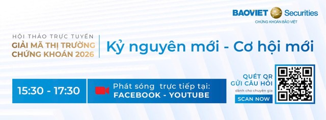 Nhằm hỗ trợ nhà đầu tư có cái nhìn toàn diện và hệ thống trước thềm giai đoạn chuyển giao chu kỳ, Công ty cổ phần Chứng khoán Bảo Việt (BVSC) tổ chức hội thảo trực tuyến với chủ đề “Giải mã thị trường chứng khoán 2026: Kỷ nguyên mới – Cơ hội mới”, diễn ra vào ngày 30/12/2025.