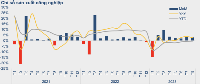 Trong báo cáo vĩ mô mới phát hành, Công ty Chứng khoán Bảo Việt (BVSC) đánh giá, chỉ số sản xuất công nghiệp trong tháng 8/2023 tăng 2,87% so với tháng 7/2023 và 2,62% so với cùng kỳ năm trước. Tính chung 8 tháng đầu năm, chỉ số sản xuất công nghiệp vẫn đang giảm 0,45% so với cùng kỳ.