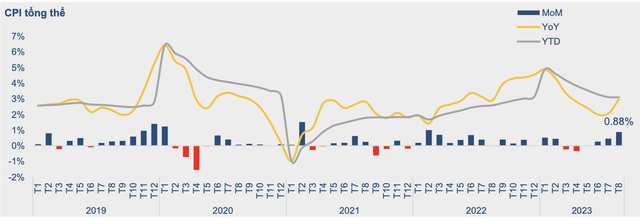 Trong tháng 8, chỉ số CPI tăng 2,96% so với cùng kỳ mức tăng mạnh nhất kể từ tháng 3 cho tới nay, đồng thời tăng mạnh 0,88% so với tháng trước, cao nhất từ tháng 2/2022. Tính chung 8 tháng đầu năm, chỉ số CPI trung bình tăng 3,1% so với cùng kỳ. Với quan điểm thận trọng, BVSC dự báo chỉ số CPI cả năm 2023 sẽ chỉ ở khoảng 3 - 3,5%, thấp hơn nhiều so với mục tiêu Chính phủ đặt ra (4,5%).