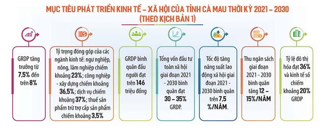 Giai đoạn 2026 - 2030, mục tiêu là đưa Cà Mau trở thành tỉnh có nền sản xuất công nghiệp phát triển khá, tạo động lực phát triển nhanh các ngành dịch vụ, đô thị và nâng cao hiệu quả kinh tế nông nghiệp.