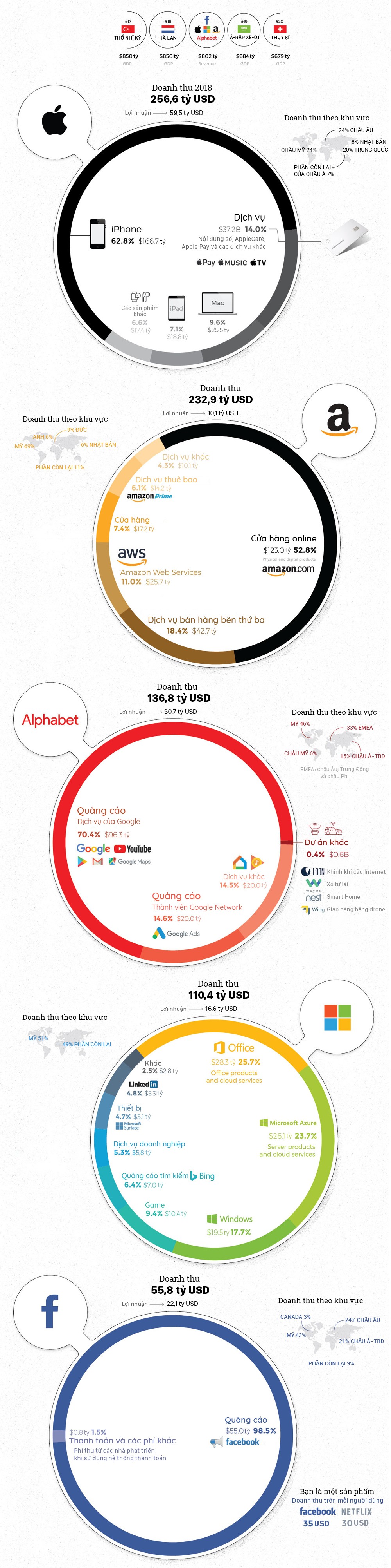 Trong năm 2018, Amazon, Apple, Alphabet, Facebook và Microsoft đạt tổng doanh thu 802 tỷ USD, cao hơn cả GDP của Thụy Sĩ hay Ả-rập Xê-út.