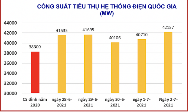 A0 cũng cho biết, trong những ngày gần đây, công suất tiêu thụ điện toàn quốc đều ở mức trên dưới 42.000 MW - tức cao hơn mức công suất đỉnh năm 2020 tới gần 10%.