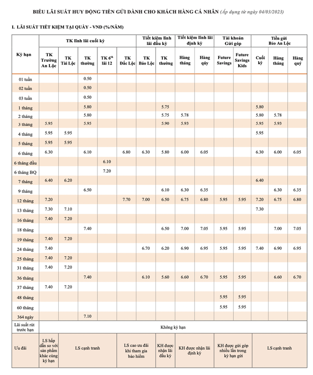 Khảo sát của Báo Đầu tư Chứng khoán trên thị trường cho thấy, tại TPBank biểu lãi suất đã giảm ngay từ ngày 4/3/2023. Ví dụ, kỳ hạn 6 tháng tiết kiệm Đắc Lộc xuống còn 6,8%/năm so với 7,3%/năm của biểu lãi suất ngày 14/1/2023; 9 tháng còn 6,5%/năm so với trước đó là 7%/năm. Còn các kỳ hạn dài 12 tháng, 36 tháng vẫn giữ nguyên.