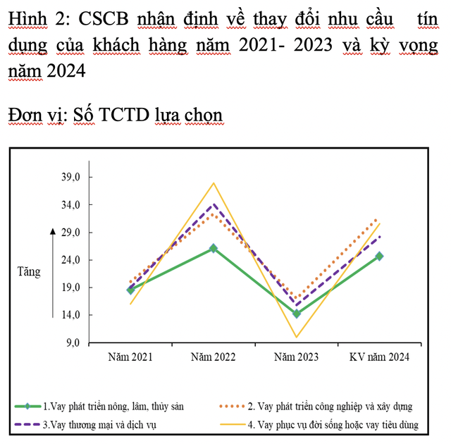 Ngoài ra, trong 6 tháng đầu năm 2024, các TCTD dự kiến giữ ổn định các điều kiện và điều khoản cho vay tổng thể đối với khách hàng doanh nghiệp và nới lỏng hơn đối với khách hàng cá nhân (dự kiến áp dụng đối với lĩnh vực vay phục vụ đời sống, vay mua bất động sản để ở).