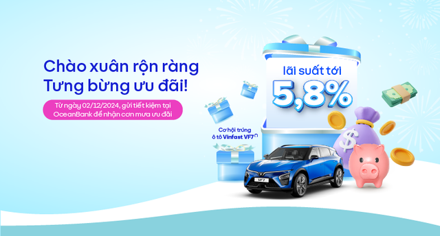 Là ngân hàng tung chương trình Tết sớm nhất thị trường từ ngày 02/12/2024, OceanBank chào đón khách hàng tham gia gửi tiết kiệm nhân dịp Xuân Đinh Tỵ 2025 trong chương trình “Chào xuân rộn ràng - Tưng bừng lãi suất”. Với các kỳ hạn dưới 12 tháng sẽ được hưởng mức lãi suất thuộc top dẫn đầu thị trường. Cụ thể, kỳ hạn 01 tháng - 4.3%; 03 tháng - 4,6%; 06 tháng - 5,5%; 12 tháng - 5,8%. Đặc biệt, khi gửi tiết kiệm kỳ hạn 06 tháng, khách hàng đồng thời được hưởng trọn vẹn chương trình khuyến mại "Gửi tiền liền tay - Nhân đôi tài lộc”, cơ hội trúng xe ô tô Vinfast VF7, điện thoại iPhone 16 Promax, tai nghe Airpod 4….