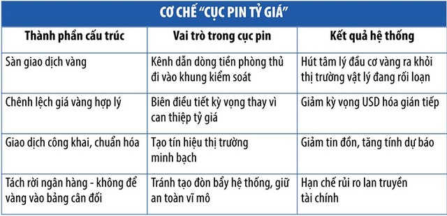 Thực tế này dẫn ta đi đến tư duy ngược: thay vì dùng USD đỡ vàng, ta nên tạo cơ chế biến vàng thành “cục pin tâm lý” có thể sạc đầy niềm tin khi VND bị nghi ngờ, mà không cần tiêu tốn ngoại tệ. Khi không thể “phát điện” bằng USD, Chính phủ cần sạc lại niềm tin qua vàng như một lớp đệm để hấp thụ lo lắng. Điều này có thể được thực hiện thông qua cơ chế “cục pin tỷ giá” (xem bảng).