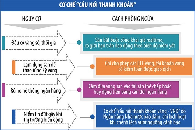 Mỗi khi thị trường biến động, Ngân hàng Nhà nước có thể triển khai cơ chế “cầu nối thanh khoản”. Đây là công cụ giúp người dân có thể chuyển từ vàng sang VND (và ngược lại) qua các định chế được kiểm soát (các ngân hàng thương mại, quỹ bình ổn vàng, các định chế sản xuất - kinh doanh vàng được chỉ định), mà không làm rối loạn thị trường vàng vật lý hay gây áp lực tỷ giá (xem bảng).