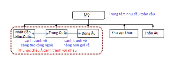 Các tác giả đã sử dụng hai biểu đồ. Biểu đồ đầu tiên cho thấy một nền kinh tế quốc tế tập trung vào Mỹ như một trung tâm nhu cầu toàn cầu.
