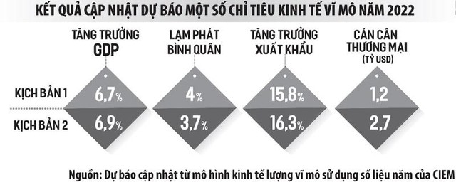 Theo nhóm nghiên cứu, dù lạm phát cơ bản vẫn ổn định ở mức tương đối thấp, 2,44% trong 6 tháng đầu năm, nhưng áp lực điều hành lạm phát dự báo gia tăng trong các tháng cuối năm. Vì vậy, ở cả 2 kịch bản cập nhật triển vọng kinh tế 2022 mà CIEM vừa công bố, lạm phát bình quân được dự báo ở mức 4% (với kịch bản tăng trưởng GDP là 6,7%) và 3,7% (với kịch bản tăng trưởng GDP đạt 6,9%).