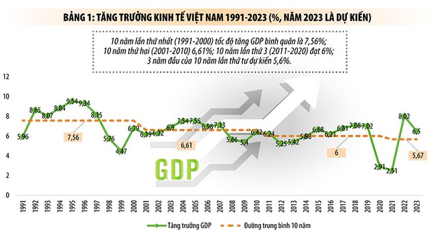 Ở góc độ tăng trưởng, nhìn trong giai đoạn gần 30 năm qua, kinh tế nước ta đang suy giảm nhanh chóng. Cứ 10 năm, tăng trưởng GDP trung bình giảm hơn 0,5 điểm phần trăm (xem bảng 1). Nếu muốn đạt mục tiêu mong muốn trong giai đoạn 2021-2025 khoảng 7%/năm mà Kế hoạch Phát triển kinh tế - xã hội 5 năm 2021-2025 đã đặt ra, thì năm 2024 và 2025 phải đạt mức tăng trưởng trung bình 9%/năm...