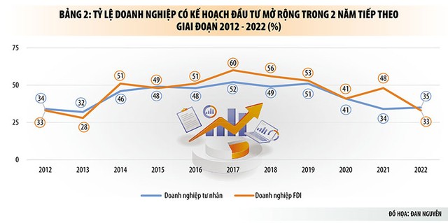 Hậu quả là, các doanh nghiệp có xu hướng trì hoãn đầu tư mở rộng quy mô, ngành nghề kinh doanh. Tỷ lệ số doanh nghiệp (trong nước và FDI) có kế hoạch đầu tư mở rộng trong 2 năm tới đã giảm xuống mức thấp nhất kể từ năm 2014 (xem bảng 2).