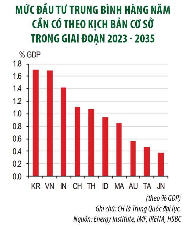 Ở cấp độ nền kinh tế riêng lẻ trong cùng một kịch bản cơ sở, Trung Quốc sẽ cần nguồn kinh phí nhiều nhất với khoảng 3.400 tỷ USD, tiếp theo là Ấn Độ ở vị trí thứ hai với khoảng cách khá xa, khoảng 921 tỷ USD. Tất cả nhóm Hàn Quốc, Indonesia, Nhật Bản, Úc, Việt Nam, Thái Lan, Malaysia và Đài Loan sẽ cần tổng cộng 1.360 tỷ USD, tương đương 40% nhu cầu đầu tư của Trung Quốc đại lục. Chi phí đầu tư ước tính của Việt Nam (135,6 tỷ USD) nằm ở mức trung bình trong khối ASEAN.