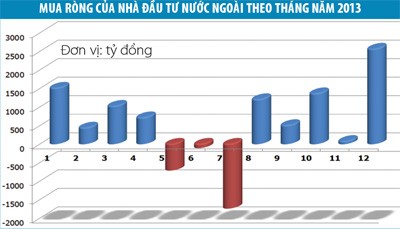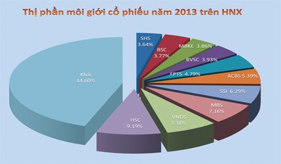 | Những con số nổi bật 2013 2.543.584 tỷ đồng là tổng sản phẩm trong nước (GDP) năm 2013 tính theo giá so sánh năm 2010, tăng 5,42% so với năm 2012. Mức tăng trưởng GDP thấp hơn mục tiêu tăng 5,5% đề ra, nhưng cao hơn mức tăng 5,25% của năm 2012. 1.091.100 tỷ đồng là tổng vốn đầu tư toàn xã hội thực hiện trong năm 2013, tăng 8% so với năm 2012 và bằng 30,4% GDP. 195.400 tỷ đồng là tổng mức bội chi ngân sách trong năm 2013, bằng 5,3% GDP, vượt mức 4,8% đã dự toán. 6,6% là mức tăng CPI năm 2013, thấp hơn nhiều so với mức tăng 9,21% của năm 2012 và nằm trong ngưỡng dưới 7% mà Quốc hội đặt ra. 12,51% là mức tăng trưởng tín dụng năm 2013. Con số này gây bất ngờ, bởi con số tăng trưởng tín dụng đến ngày 12/12/2013 mới chỉ đạt 8,83%, trong khi kế hoạch là 12%. 21,89% là mức tăng của VN-Index trong năm 2013, từ 413,73 điểm, lên 504,63 điểm. Trong khi đó, HNX-Index cũng có mức tăng 18,83%, từ lên 67,84 điểm. 948.976 tỷ đồng là giá trị vốn hóa thị trường chứng khoán Việt Nam tính đến cuối năm 2013, bằng 37,31% GDP. 326 triệu USD, tương đương 6.842,9 tỷ đồng là số tiền mà nhà đầu tư nước ngoài đã mua ròng trên thị trường chứng khoán niêm yết Việt Nam trong năm 2013. 676 là số cổ phiếu đang niêm yết trên 2 sàn tính đến cuối năm 2013. Ngoài ra, có 2 chứng chỉ quỹ còn niêm yết, cùng 143 cổ phiếu đăng ký giao dịch trên UPCoM. 30.000 tỷ đồng là gói hỗ trợ tín dụng nhà ở được triển khai trong năm 2013, với lãi suất 6%/năm, sang năm 2014, lãi suất được giảm xuống còn 5%/năm. Tuy nhiên, do còn nhiều vướng mắc, nên gói hỗ trợ này chỉ được giải ngân nhỏ giọt và chưa phát huy được hiệu quả như mong muốn. 62,6% là tổng thị phần môi giới chứng khoán trên HOSE trong năm 2013 thuộc về 10 công ty chứng khoán có thị phần lớn nhất, hơn 90 công ty còn lại phải chia nhau 37,4% thị phần còn lại. Trên HNX, Top 10 dù chiếm ít hơn, nhưng cũng chiếm tới 55,4% thị phần. 1.372 tỷ đồng là giá trị giao dịch bình quân/phiên trong năm 2013 của cổ phiếu và chứng chỉ quỹ, tăng 5,23% so với năm 2012. Khối lượng giao dịch bình quân/phiên trong năm 2013 là 106,6 triệu đơn vị. 203.951 tỷ đồng là tổng giá trị huy động vốn trái phiếu chính phủ năm 2013, tăng 30,73% so với năm 2012. 76.955 là số doanh nghiệp đăng ký thành lập mới trong năm 2013, tăng 10,1% so với năm 2012, với tổng vốn đăng ký 398.700 tỷ đồng, giảm 14,7%. Tuy nhiên, có 60.737 doanh nghiệp giải thể hoặc ngừng hoạt động trong năm 2013, tăng 11,9% so với năm 2012. |