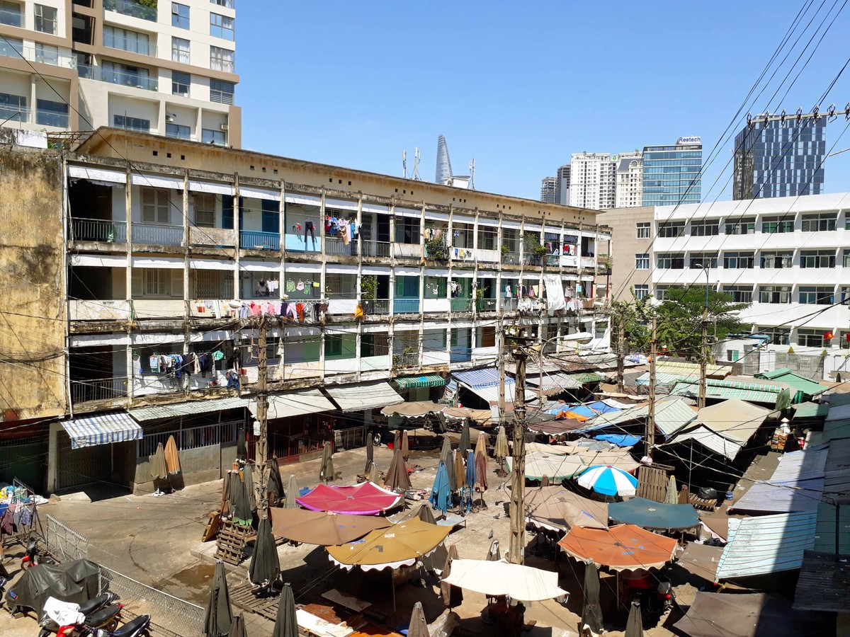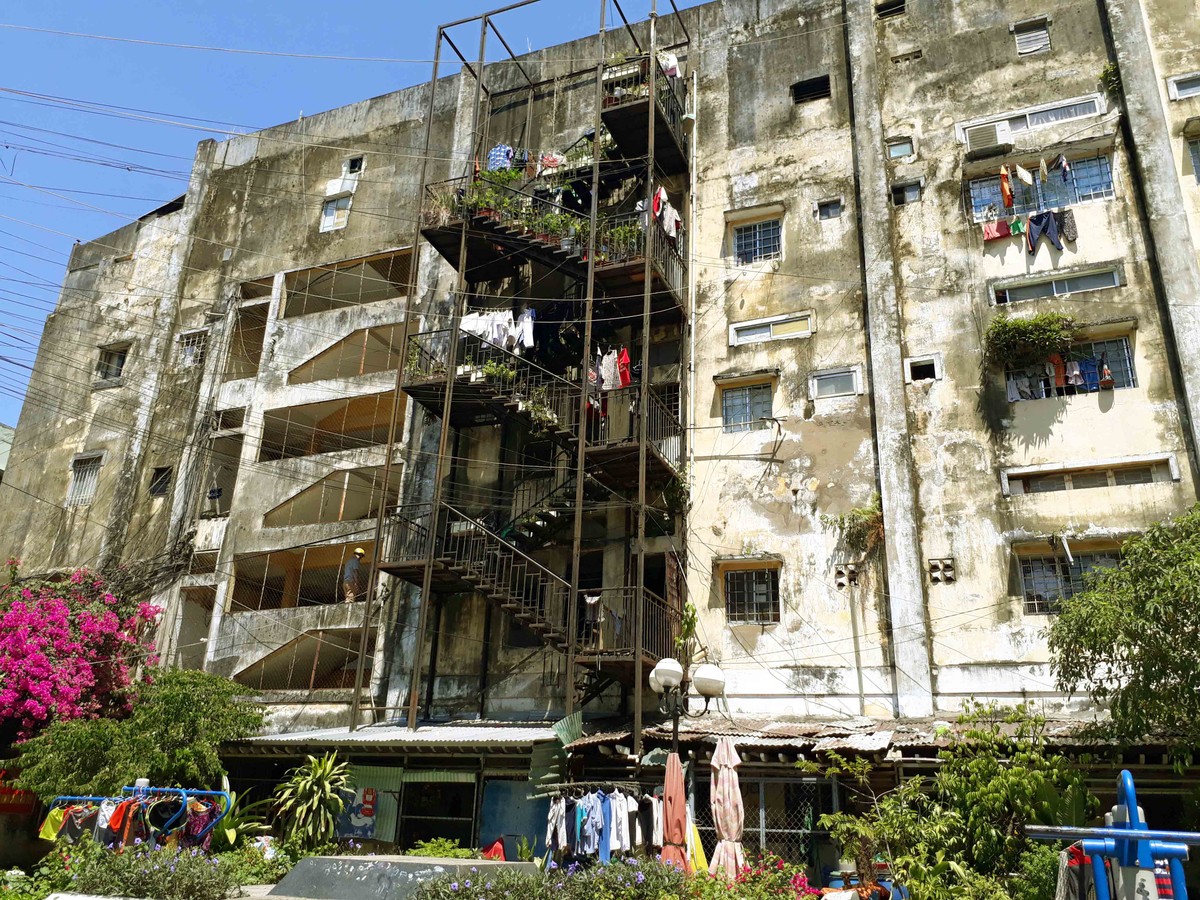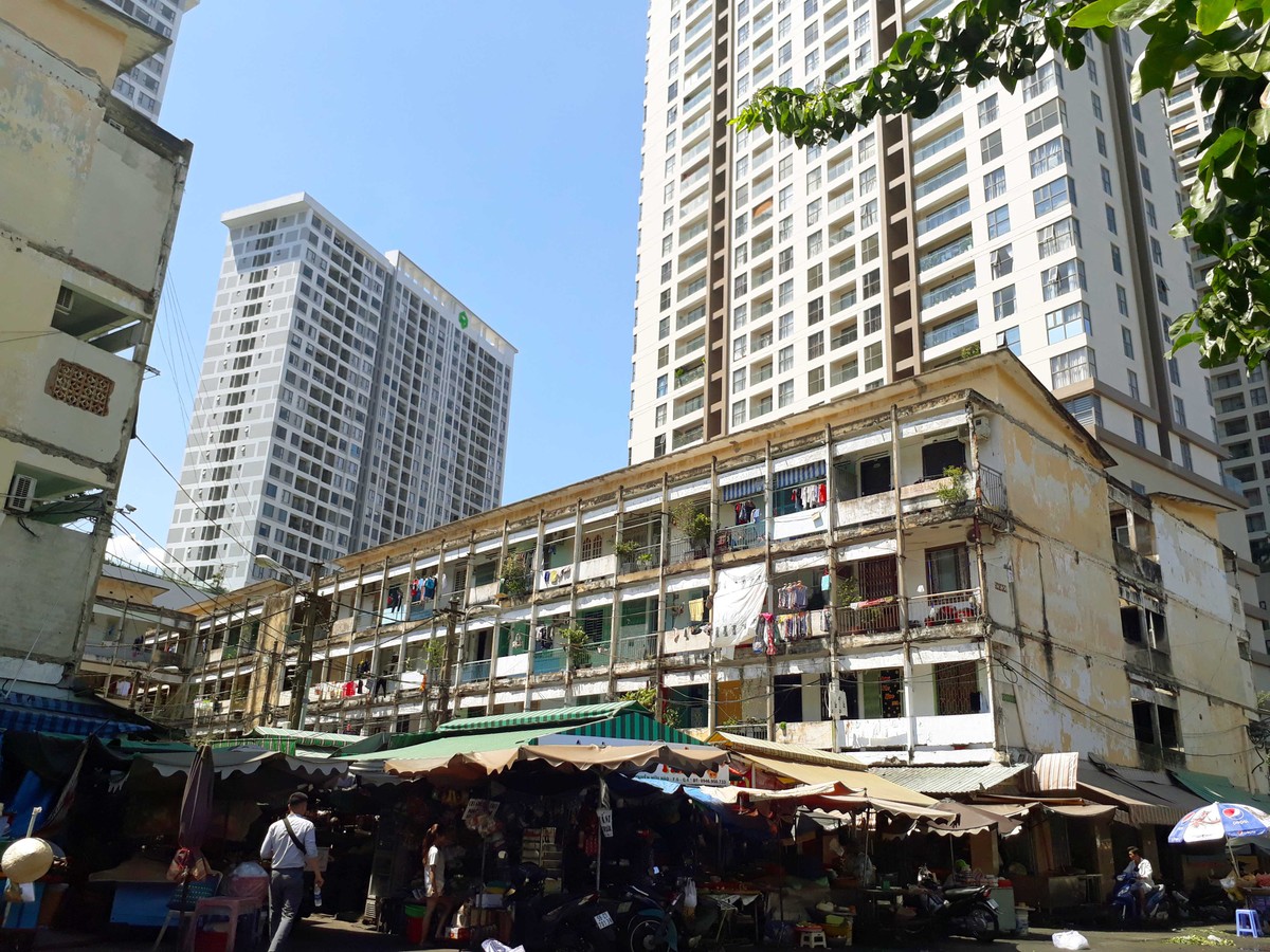 Nằm ngay dưới chân cầu Ông Lãnh và những tòa nhà cao tầng mới xây, chung cư Vĩnh Hội cũng thuộc diện phải di dời gấp.