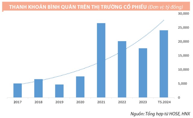 Thanh khoản thị trường tăng cao khi giá trị giao dịch bình quân 5 tháng đầu năm 2024 đạt 24.400 tỷ đồng, tăng 40% so với bình quân năm 2023 và gấp 8 lần so với mức hơn 3.000 cuối năm 2016.