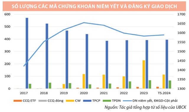 Tính đến hết tháng 5/2024, từ 2 mã chứng khoán ban đầu, trên thị trường đã có 2.183 mã chứng khoán giao dịch, trong đó 1.589 mã chứng khoán niêm yết và đăng ký trên 3 sàn HOSE, HNX và UPCoM, 15 mã chứng chỉ quỹ ETF, 4 mã chứng chỉ quỹ đóng, 114 chứng quyền có bảo đảm, 395 mã trái phiếu chính phủ, 66 mã trái phiếu doanh nghiệp.
