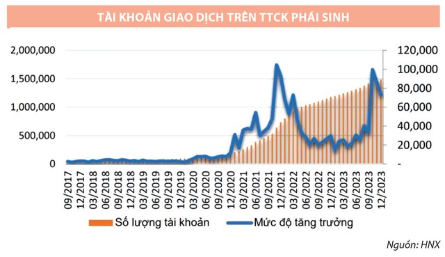 Sau 7 năm hoạt động, TTCK phái sinh đã có bước tăng trưởng rất tốt, ổn định và thu hút ngày càng nhiều nhà đầu tư tham gia. Qua đó, quy mô thị trường và thanh khoản của sản phẩm hợp đồng tương lai chỉ số VN30 có sự tăng trưởng mạnh mẽ, với mức tăng bình quân 38,6%/năm trong giai đoạn 2018 - 2022, trong đó năm 2020 có tốc độ tăng trưởng cao nhất là 79,9%, năm 2022 tăng trưởng 43,8%. Tính từ đầu năm 2024 đến hết tháng 5, khối lượng giao dịch bình quân đạt 21.900 hợp đồng/phiên, giá trị giao dịch bình quân đạt 27.200 tỷ đồng. Số tài khoản nhà đầu tư phái sinh đạt 1,5 triệu vào cuối năm 2023.