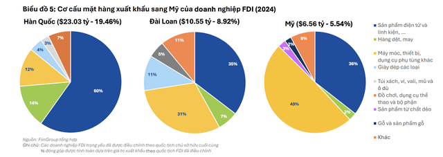 Ví dụ, trong năm 2024, khoảng 60% giá trị xuất khẩu của doanh nghiệp Hàn Quốc tại Việt Nam là sản phẩm điện tử, tỷ lệ này ở doanh nghiệp Đài Loan là 35%, còn với doanh nghiệp Mỹ đầu tư tại Việt Nam, nhóm điện tử và máy móc thiết bị chiếm đến 85%. Điều này phản ánh chiến lược phát triển dài hạn và bài bản của các tập đoàn đa quốc gia, đồng thời cho thấy Việt Nam hiện vẫn chủ yếu đóng vai trò “công xưởng gia công” thay vì là trung tâm sáng tạo công nghệ.