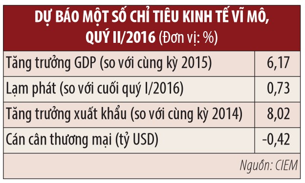 Dựa trên những tính toán theo mô hình kinh tế lượng vĩ mô, sử dụng số liệu quý, CIEM dự báo tăng trưởng GDP quý II đạt 6,17%. Tăng trưởng xuất khẩu dự báo ở mức 8,02%, thấp hơn so với cùng kỳ 2015 (đạt 9,28%); thâm hụt thương mại ở mức 0,42 tỷ USD, chủ yếu do cầu đầu tư và nhập khẩu tăng; CPI tăng khoảng 0,73%, cao hơn mức 0,65% cùng kỳ năm 2015.