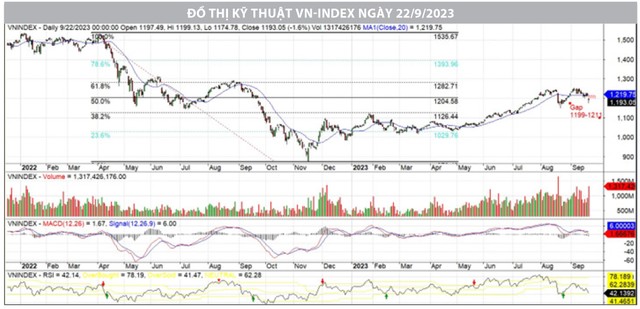 VN-Index đóng cửa phiên cuối tuần tại 1.193 điểm, khép lại tuần giao dịch giảm điểm thứ hai liên tiếp. Mặc dù dưới khung thời gian tuần, yếu tố kỹ thuật chưa quá xấu khi ngưỡng hỗ trợ mạnh cuối cùng tại 1.190 điểm chưa bị vi phạm, tuy nhiên mặt bằng giá của thị trường đã thay đổi đáng kể, nhiều nhóm cổ phiếu có mức giá bị chiết khấu rất sâu. Đây là tuần giao dịch với hai sự kiện lớn, gồm đáo hạn phái sinh và Fed cập nhật chính sách lãi suất mới khiến cho tâm lý giao dịch đã trở nên thận trọng hơn rất nhiều, lực cầu giảm sút mạnh.