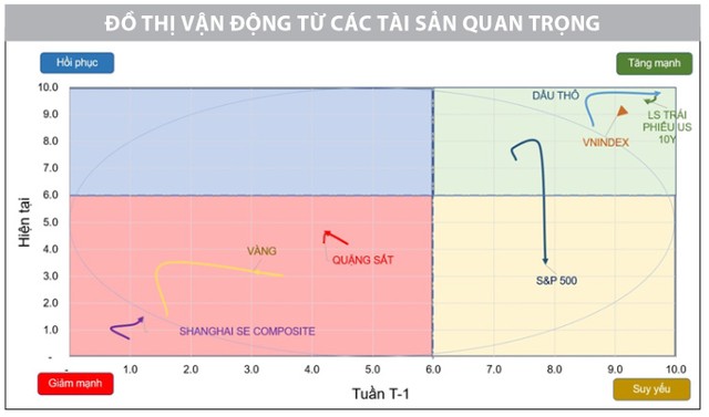 Quyết định của Fed đã giúp US Dollar Index (DXY), lợi suất trái phiếu chính phủ Mỹ tiếp diễn đà tăng, nhưng các chỉ số chứng khoán toàn cầu và giá dầu lại suy giảm trước lo ngại quá trình hồi phục của kinh tế Mỹ và thế giới còn kéo dài. Trong tuần, lợi suất trái phiếu kỳ hạn 10 năm của Mỹ vượt mốc 4,49%/năm, mức cao nhất kể từ năm 2007, với chất xúc tác mới nhất là dữ liệu thất nghiệp hàng tuần cho thấy thị trường lao động vẫn mạnh mẽ có thể khuyến khích Fed tiếp tục duy trì mặt bằng lãi suất cao kéo dài. Ngược lại, các chỉ số chứng khoán Mỹ và châu Á đều có biểu hiện rung lắc mạnh vào các phiên cuối tuần, đặc biệt là S&P 500 đã quay đầu từ vùng tăng mạnh đi vào vùng suy yếu. Điểm sáng trong tuần là thị trường chứng khoán Trung Quốc, khi chỉ số Shanghai SE Composite đã vận động tích cực, chuẩn bị tiến vào phía trong vòng elipse, một khi thành công thì sẽ là khởi đầu manh nha cho giai đoạn “thay da đổi thịt” của chỉ số này, cải thiện và dần thoát ly vùng giảm mạnh.