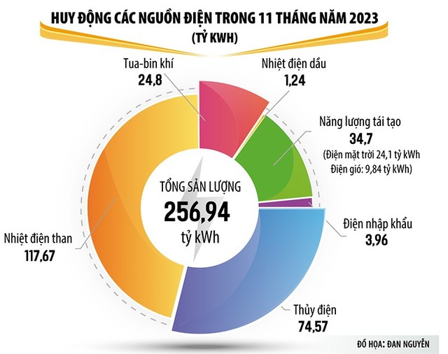 Cụ thể, thủy điện được lên kế hoạch đóng góp gần 80,5 tỷ kWh; nhiệt điện than đóng góp 159,3 tỷ kWh, nhiệt điện khí đóng góp 23,1 tỷ kWh (trong đó, khí LNG là 768 triệu kWh), năng lượng tái tạo các loại đóng góp 40 tỷ kWh (điện gió là 11,1 tỷ kWh và điện mặt trời là 25,7 tỷ kWh).