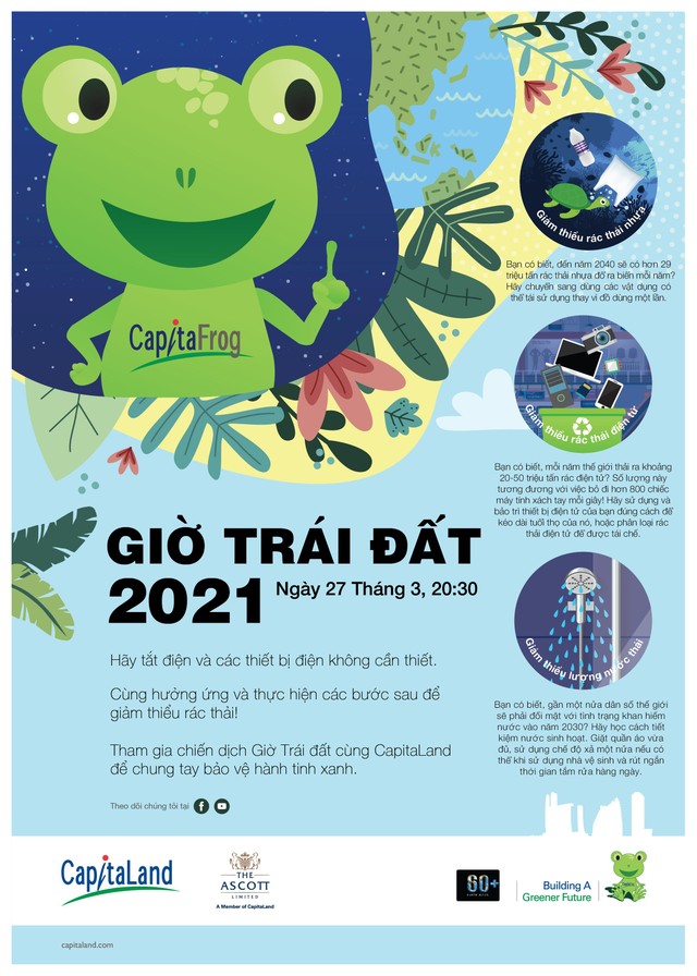 Cụ thể tại Việt Nam, hơn 23 dự án của CapitaLand tại 10 thành phố đã tham gia vào chiến dịch này. Từ 8h30 tối 27/3, CapitaLand Việt Nam và đơn vị kinh doanh lưu trú thuộc sở hữu của tập đoàn, The Ascott Limited (Ascott) đã tắt đèn chiếu sáng mặt tiền của tòa nhà và các thiết bị điện không cần thiết. CapitaLand Việt Nam và Ascott cũng sẽ khuyến khích khách hàng, nhân viên và các bên hữu quan cùng chung tay xây dựng lối sống bền vững hơn thông qua hoạt động chia sẻ các mẹo về cách giảm thiểu rác thải nhựa, điện tử và nước.