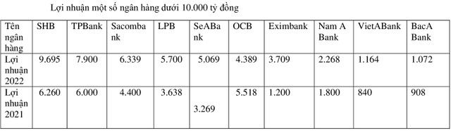 Dù khiêm tốn hơn, nhưng các nhà băng các cũng báo lãi nghìn tỷ với mức tăng trưởng 2 con số trong năm 2022 như Sacombank (6.339 tỷ đồng, tăng 44%), SHB (9.659 tỷ đồng, tăng 54%), TPBank (7.828 tỷ đồng, tăng 30%)...