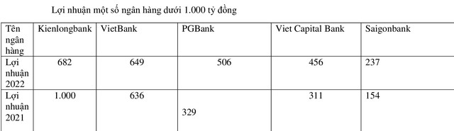 Nhóm ngân hàng có lợi nhuận dưới 1.000 tỷ đồng bao gồm: Kienlongbank, PGBank, Ngân hàng Bản Việt, Saigonbank và NCB.