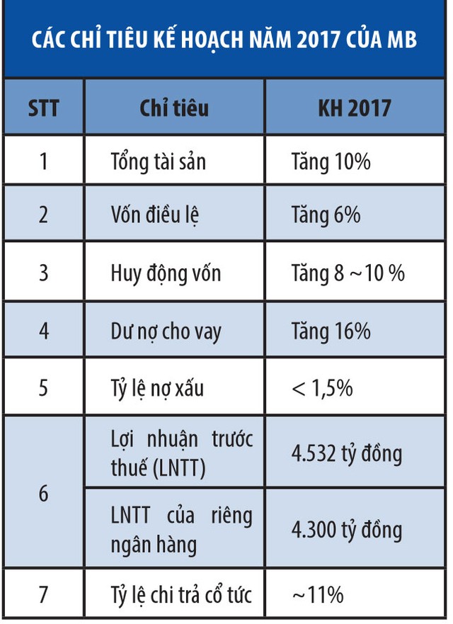 Năm 2017, MB sẽ thực hiện 4 chuyển dịch chiến lược then chốt gồm: ngân hàng số, củng cố quan hệ khách hàng, quản trị rủi ro vượt trội và quản lý hiệu quả hoạt động các công ty thành viên.