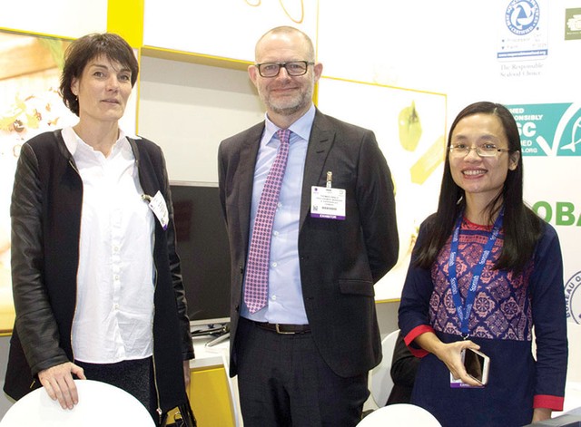 Bà Tâm chụp ảnh cùng khách hàng đến thăm gian hàng của Vĩnh Hoàn tại Triển lãm Thủy sản toàn cầu Brucxel 2015