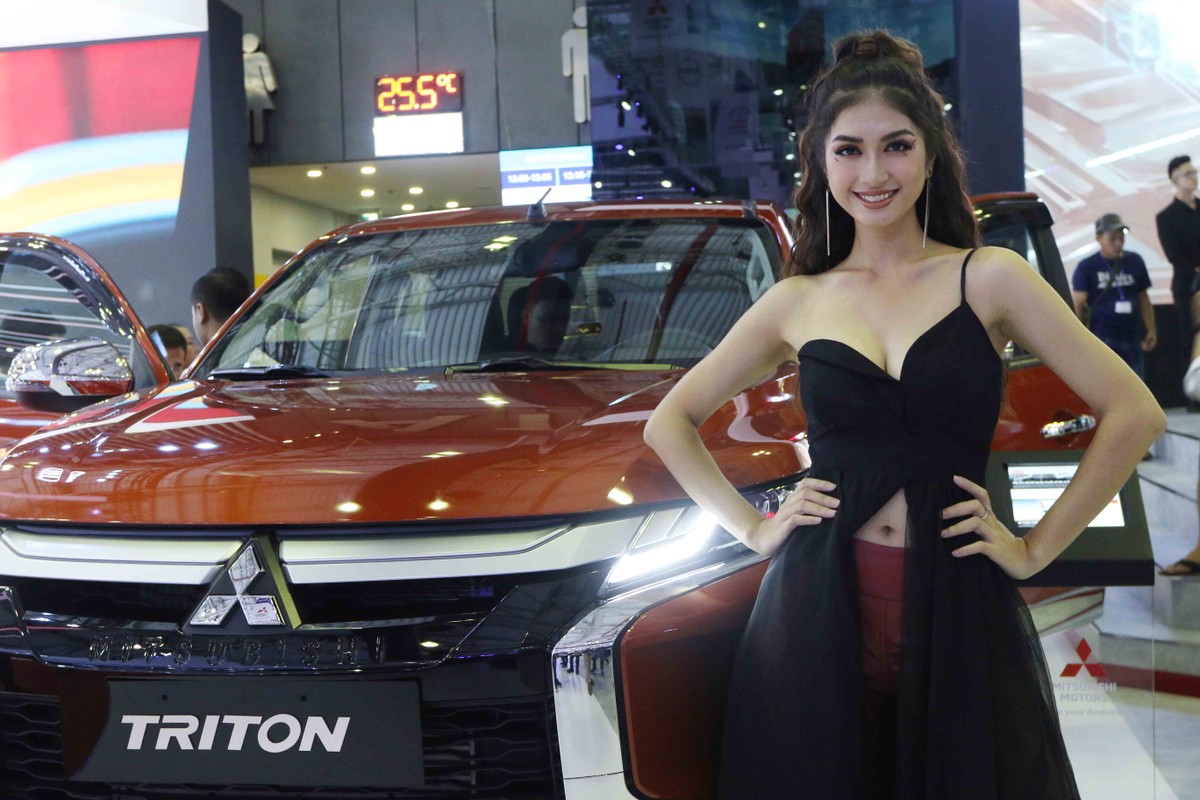 Tạo dáng bên xe Mishubishi.