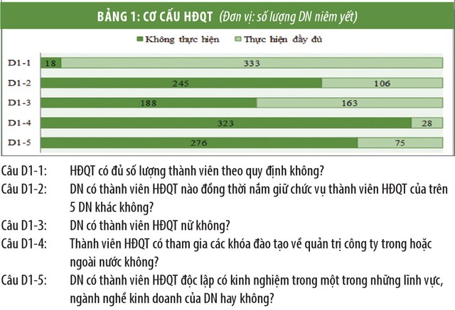 Kết quả khảo sát cho thấy, số lượng thành viên HĐQT độc lập có kinh nghiệm trong lĩnh vực, ngành nghề kinh doanh chính của DN chỉ đạt 21,37% (D1-5). Ngoài ra, chỉ có 7,98% DN niêm yết ý thức được việc đào tạo cho các thành viên HĐQT về quản trị công ty khi có tham dự các khóa đào tạo về nội dung này (D1-4).