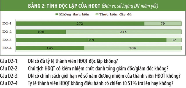 Theo quy định tại Luật Doanh nghiệp năm 2014, các công ty cổ phần hoạt động theo mô hình 2 lớp cần đảm bảo tỷ lệ thành viên HĐQT độc lập là 1/5. Trong khuôn khổ phạm vi đánh giá năm nay, 100% DN niêm yết hoạt động theo mô hình 2 lớp. Trong đó, chỉ có 22,5% DN đảm bảo được số lượng thành viên HĐQT độc lập là 1/5 (D2-1).