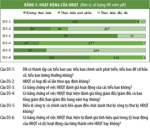 Tuy đây là một thông lệ tốt phổ biến trên thế giới, nhưng vẫn còn khá xa lạ với các DN Việt Nam. Cụ thể, chỉ có 32 trên tổng 351 DN niêm yết được đánh giá (tương đương với 9,12%) có chính sách giới hạn về số năm đương nhiệm của thành viên HĐQT (D2-3).