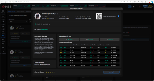Tất cả các chuyên gia ở đây 100% đã có chứng chỉ hành nghề và rất nhiều trong số đó là những chuyên gia dày dặn kinh nghiệm nhiều năm – trải qua những giai đoạn thăng trầm nhất của thị trường; thậm chí là những người khá có tiếng trên thị trường, là giám đốc của các chi nhánh của MBS. Hệ thống PRO-ADVICE hoạt động công khai, minh bạch; cho phép các NĐT có thể nhìn thấy lịch sử từng khuyến nghị cũng như hiệu quả đầu tư 1 tháng – 3 tháng – 1 năm của bất cứ chuyên gia nào để lựa chọn; mà không cần lo lắng về các con số hiệu quả đầu tư được tự khai báo thiếu kiểm chứng, thậm chí nhiều trường hợp còn sử dụng các phần mềm can thiệp chỉnh sửa.