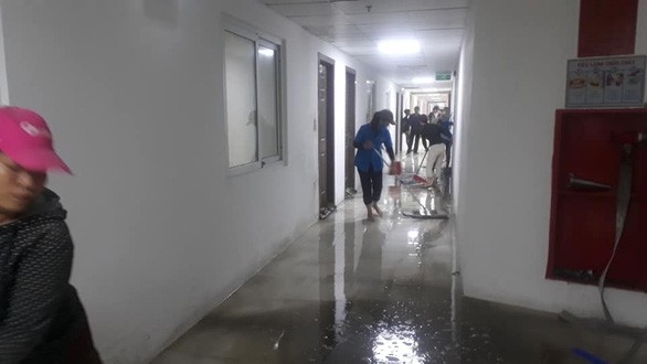 Tại hiện trường, chủ tòa nhà Mường Thanh Luxury đang cho xả nước và dọn dẹp bên ngoài.