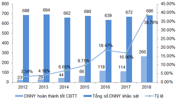 Tỷ lệ doanh nghiệp niêm yết đạt chuẩn công bố thông tin đạt 38% - tỷ lệ cao nhất trong vòng 07 năm trở lại. Nguồn: Vietstock & FiLi