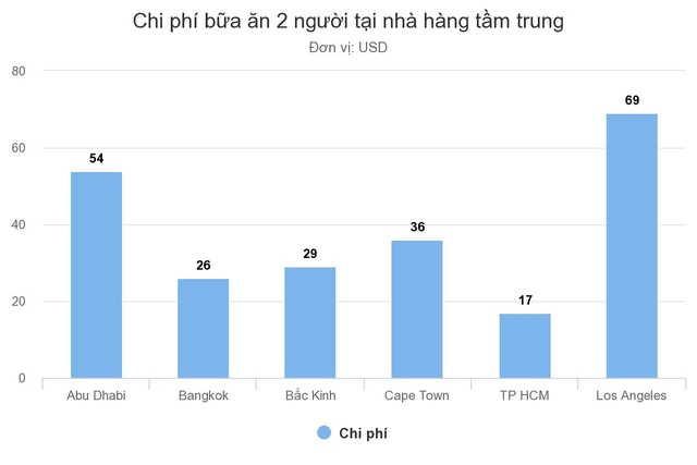 Ở TP HCM, một bữa ăn hai người tại nhà hàng tầm trung tốn 17 USD, tức gần 400.000 đồng. Tại Đông Nam Á, báo cáo chỉ có số liệu hạng mục tương tự tại Bangkok. Chi phí cho bữa ăn hai người tại nhà hàng tầm trung thủ đô Thái Lan là 26 USD, tức hơn 600.000 đồng. So với các nơi khác có ghi nhận số liệu trong khảo sát 35 thành phố trên thế giới thì bình quân chi phí ăn uống tại TP HCM cũng rẻ nhất.