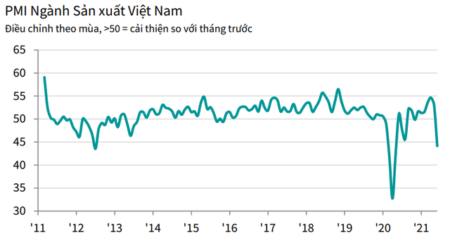 Theo IHS Markit, làn sóng các ca lây nhiễm Covid-19 mới nhất ở Việt Nam đã khiến các điều kiện kinh doanh của các nhà sản xuất suy giảm mạnh trong tháng 6. Sản lượng và số lượng đơn đặt hàng mới giảm với tốc độ nhanh nhất kể từ đợt bùng phát đầu tiên của đại dịch vào đầu năm 2020, trong khi các công ty đã giảm tương ứng số lượng việc làm và hoạt động mua hàng. Đại dịch cũng ảnh hưởng tới chuỗi cung ứng, từ đó khiến thời gian giao hàng bị kéo dài ở mức gần kỷ lục.