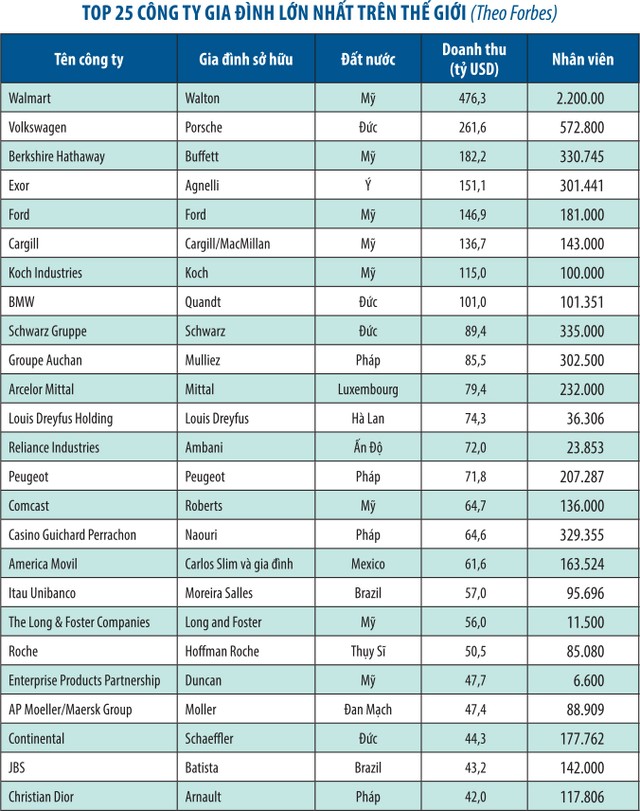 Tại Mỹ, doanh nghiệp tư nhân tạo 78% việc làm mới mỗi năm, với 60% tổng số nhân lực trên thị trường. Trong khi đó, các công ty gia đình hiện chiếm tới 1/3 danh sách doanh nghiệp thuộc chỉ số S&P 500, 40% trong số 250 công ty lớn nhất Pháp và Đức, hơn 60% doanh nghiệp lớn nhất tại Đông Á và châu Mỹ Latin.