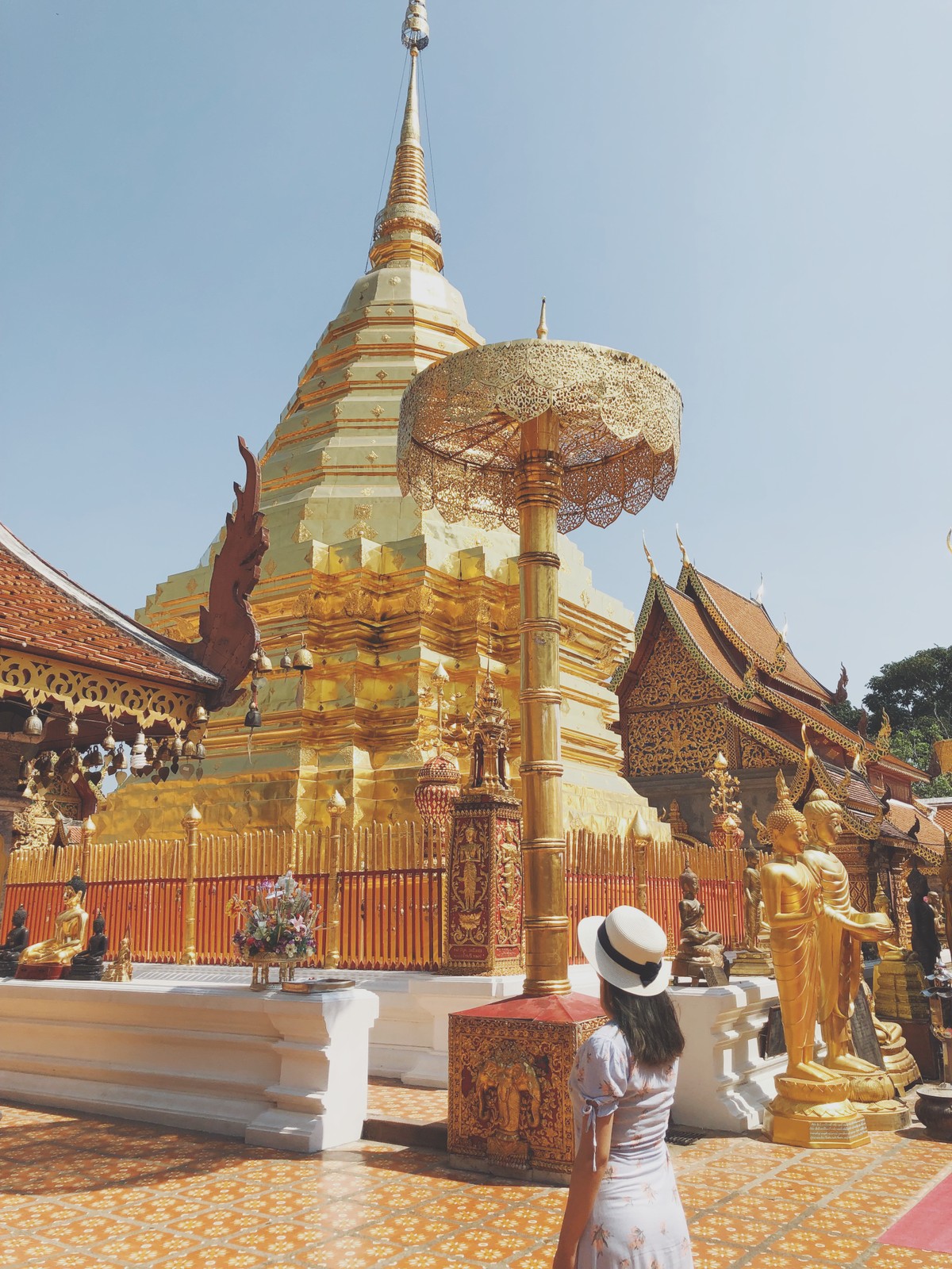 Do thời gian có hạn, tôi chỉ ghé thăm một số ngôi chùa chính. Đầu tiên, tôi chọn đến ngôi chùa xa và nổi tiếng nhất là chùa Wat Phrathat Doi Suthep, tọa lạc trên một ngọn đồi cao 1.100 m. Để tới được đây, tôi chọn đi Song Thaew, vì đường xa và khá ngoằn ngoèo. Tuy nhiên, lần tới nếu đến Chiang Mai, tôi nhất định sẽ thuê xe máy lượn lờ, vì cung đường này xanh và đẹp mê hồn.