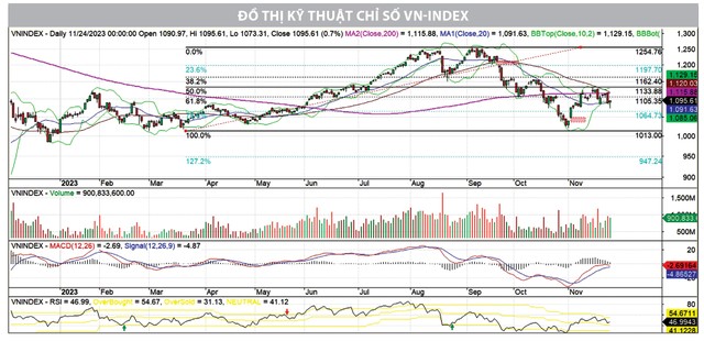 Dưới góc nhìn kỹ thuật, VN-Index đang phản ứng tích cực tại ngưỡng hỗ trợ 1.080 điểm. Mặc dù vậy, chưa có cơ sở chắc chắn để nhận định chỉ số đã kết thúc nhịp điều chỉnh và hoàn thành đáy ngắn hạn thứ hai. Hiện tại, VN-Index chưa thoát khỏi vùng giá này để hình thành một xu hướng rõ ràng, cho dù là xu hướng tăng hay giảm.