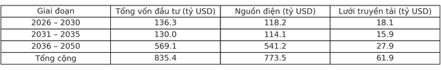 Như vậy, tổng vốn đầu tư phát triển nguồn và lưới điện giai đoạn 2026 - 2050 dự kiến ở mức 835,4 tỷ USD.
