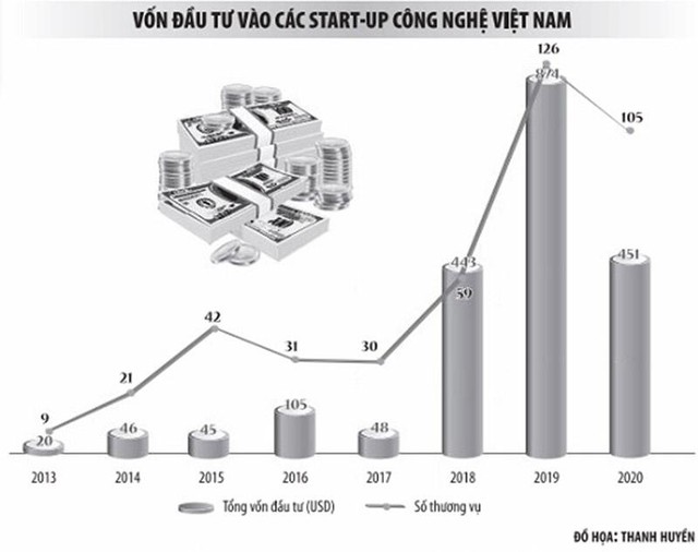 451 triệu USD là tổng vốn đầu tư vào các start-up công nghệ Việt Nam trong năm 2020, giảm 48% so với năm 2019. Trong khi đó, số lượng khoản đầu tư giảm không đáng kể, ở mức 17%, trong đó ghi nhận 60 thương vụ vào nửa cuối năm - tương đương cùng kỳ năm 2019.