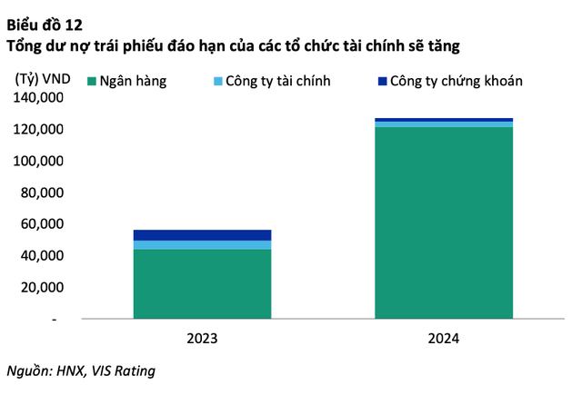 Số liệu mới nhất VIS Rating công bố đầu tháng 4/2023 cho thấy, năm 2023, tổng dư nợ trái phiếu đáo hạn của các tổ chức tài chính là gần 60.000 tỷ đồng. Bước sang năm 2024, con số này đạt trên 120.000 tỷ đồng.