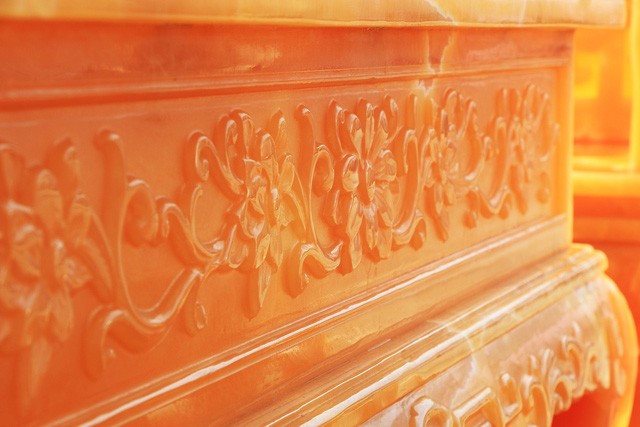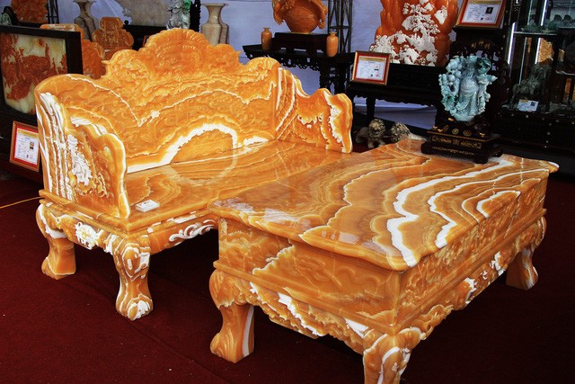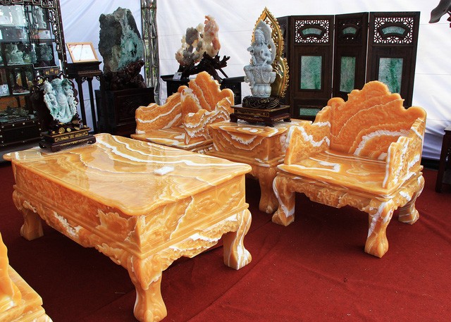 Bộ bàn ghế được chế tác từ 50 tấn ngọc Hoàng Long nhập từ Trung Mỹ, do 10 người làm trong vòng 1 năm mới hoàn thành. Chủ nhân của bộ bàn ghế “khủng” này cho biết, bộ bàn ghế có trị giá lên tới 8 tỷ đồng.